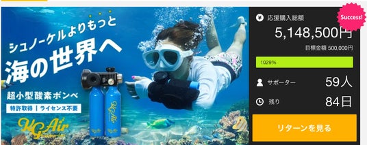 ライセンス不要。水着のままでOK!片手につける超小型酸素ボンベ『KG Air』目標金額2800%達成! 各メディアで紹介されることが決定いたしました!