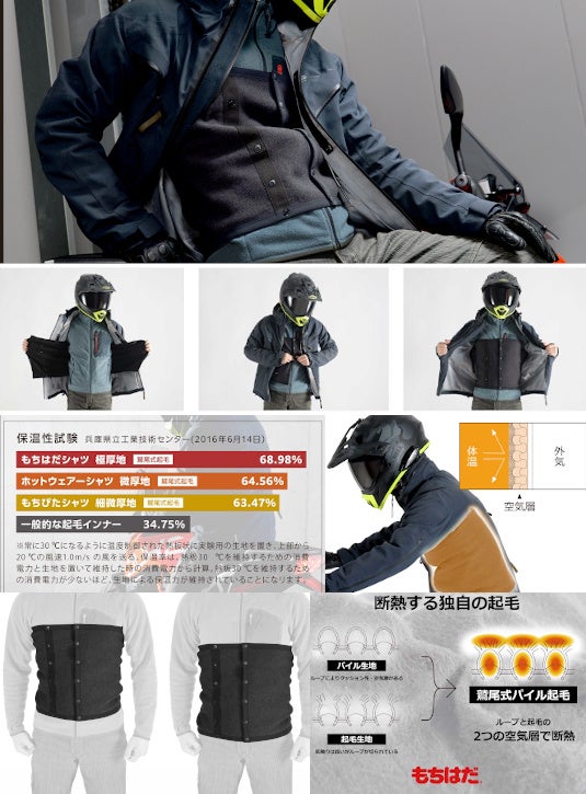 気温が15度あっても80km/hで走行した場合、ライダーの体感温度は約2度まで低下し(※1) 走行による負圧が、背側の衣類を体から離そうとします。