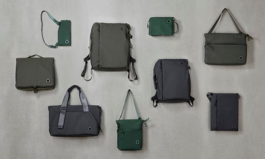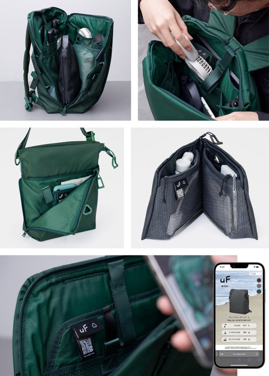 製⽷工程前の原料に着⾊し、着⾊に水を使わない無水染⾊生地「e.dye(R)」を活用したバッグの提案。環境負荷のかかる水や薬品の使用量の大幅な削減、CO2排出量も削減できることが大きなメリットになるが、⾊の発⾊がとても良く、UV耐性も高いことは、uF ディレクターズバッグの魅力ともなっている。uFの考えを示す三角の樹脂パーツは、デザインアクセントとなっていると共に、電源ケーブルやイヤホンコードなどを通せる工夫が施され、細部にわたるまでバッグとして良く作り込まれている。バッグ本体の形状バランス、佇まいもとても美しいと高い評価を集めた。
