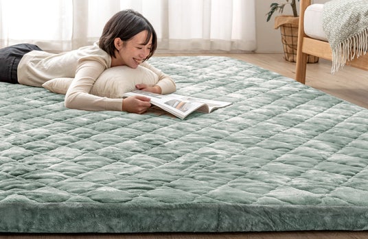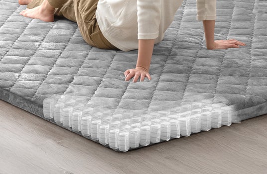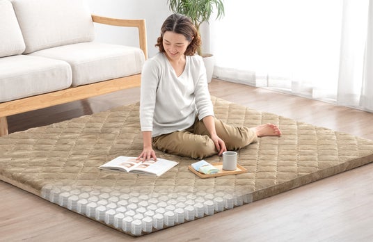 今回、極厚ラグにポケットコイルを内蔵することでより弾力のあるクッション性が加わり、底付き感のないふんわりとした座り心地をご体感いただけます。また、適度な反発力があるため、座ったり寝転んだりする際の動作もスムーズでお子様が元気に遊ぶスペースとしても安心してご使用いただけるほか、リビングや寝室など、ご家庭でのくつろぎ空間に最適です。