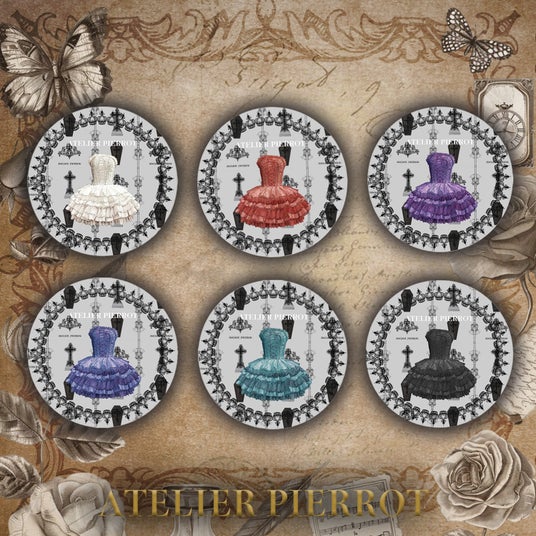 公式SNSをフォローした方にミニコルセットドレス缶バッジを差し上げます。商品をお買上げの方にはさらにもう1つプレゼント!なくなり次第終了です。