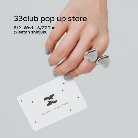 「everyday, everyone, enjoy lovely」をキーメッセージにかかげるアクセサリーブランド。年齢も性別も超えラブとクリエイティブで繋がりを作ることを目的に活動し、ハートやリボン、六芒星など、ファッションのポイントになるアイコニックなアイテムを発表しています。2022年に始動した前身ブランドGIRLS FIGHT CLUBでは、伊勢丹新宿店でポップアップストアを2回開催。33club へ改名した2024年8月には、伊勢丹新宿店に加え、博多阪急でもポップアップストアを展開します。