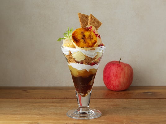 さわやな甘みの余市産りんごを中心に、コクのあるマスカルポーネブリュレ、キャラメルアイスを合わせたパフェです。