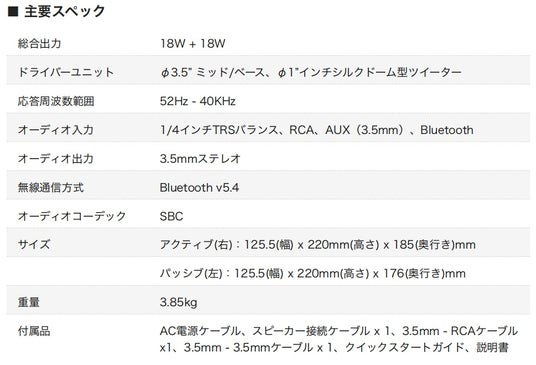 φ1インチシルクドームツイーターとφ3.5インチミッド/ベーススピーカーによる2ウェイ方式を採用、正確な音の再現を企図したアクティブスピーカーです。バスレフポートの採用により低域の量感を確保、ツイーターの周囲にはディンプル構造のウェーブガイドを配することで、フラットで伸びのある高域レスポンスを実現しました。3.5mmステレオ端子でヘッドホンもご利用いただけます。