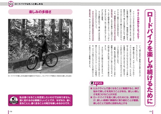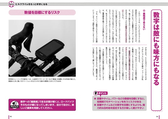 本書のターゲットはヒルクライムレースへの参加&タイムの短縮を目指す層や、無理なく登れるようになることで走る距離を延ばしていきたい初中級者です。パワートレーニングにとらわれるのではなく、ヒルクライムレースや峠を含むロングライドを「安全に」より速く・ラクに走ることを追求。「ロードバイクに乗ることがもっと楽しくなる!」ステップアップを目指すための1冊です。