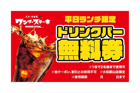 ワンダーステーキを展開する株式会社C-HUNDRED(所在地:大阪府大阪市北区、代表:細原誠は、ワンダーステーキ大和郡山店にて、「ドリンクバー無料券」の配布を実施しています。