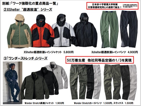1)「ワンダーストレッチ」シリーズ通年作業服 上下で税込3400円、3型50万着販売