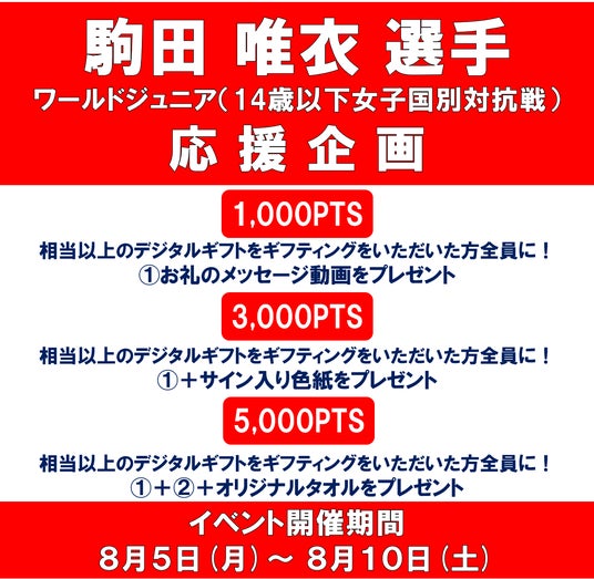 ※駒田唯衣選手以外の選手へのギフティングはリワード獲得対象外となりますのでご注意ください。