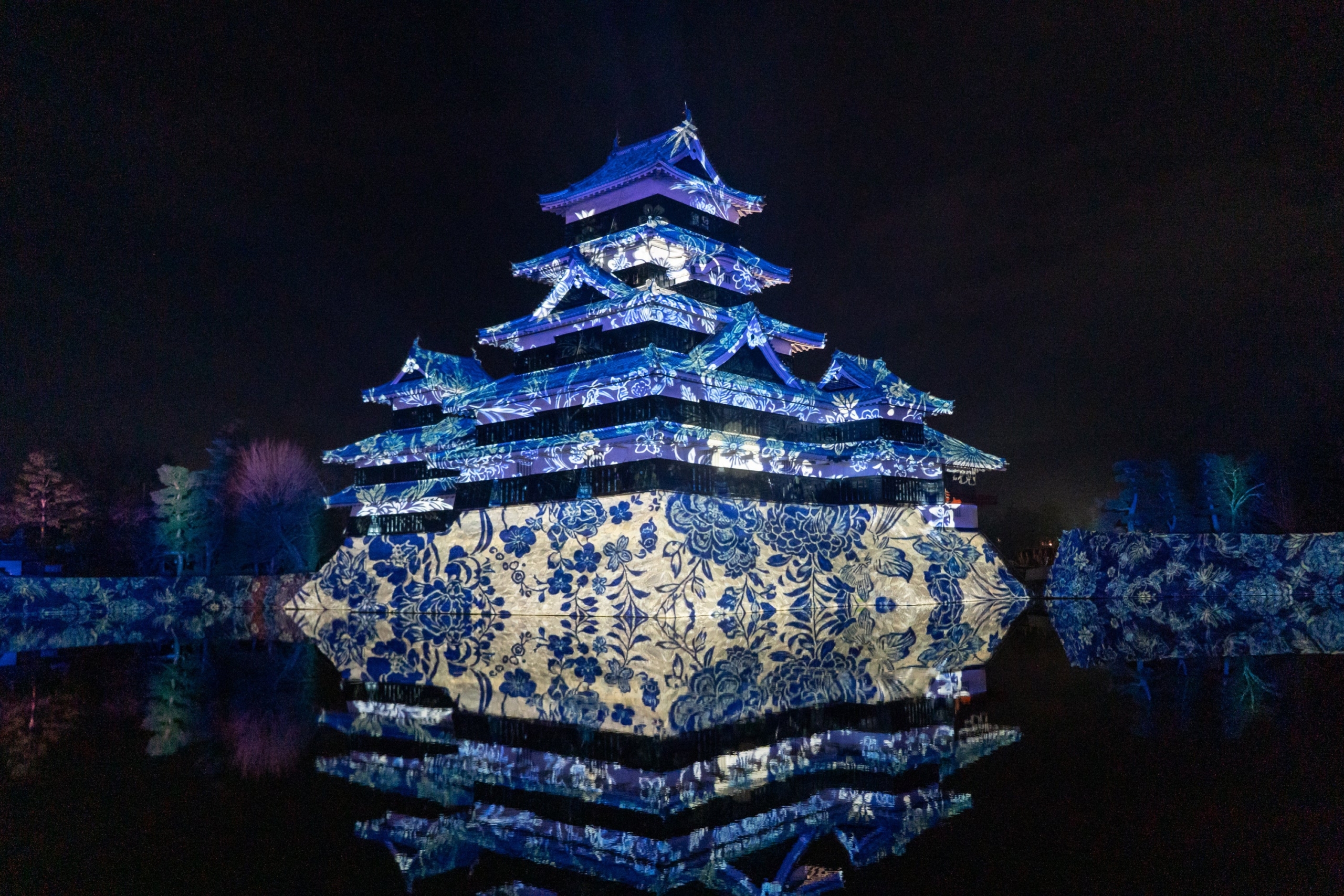 現存国宝5天守の一つで五重六階の天守の中で最古の国宝 松本城の天守や石垣に、松本市立博物館所蔵の商都松本が描かれた錦絵、絢爛豪華な屏風絵、松本てまりや提灯など松本市ならではの伝統工芸のモチーフ、春に咲き誇る桜や北アルプスの花々など、ダイナミックで幻想的なプロジェクションマッピング映像を投影しました。