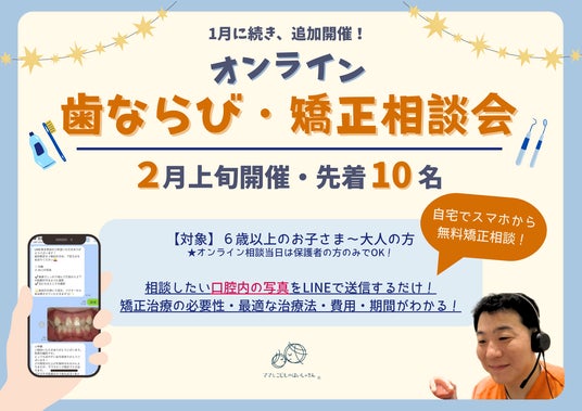 1月に開催しました、「オンライン歯ならび・矯正相談会」について、大変多くの方にお申し込みいただいたため、2月に追加開催いたします。対象は6歳以上のお子様から、大人の方になります(横浜市近辺にお住まいの方限定)。ご予約は先着順となっております。