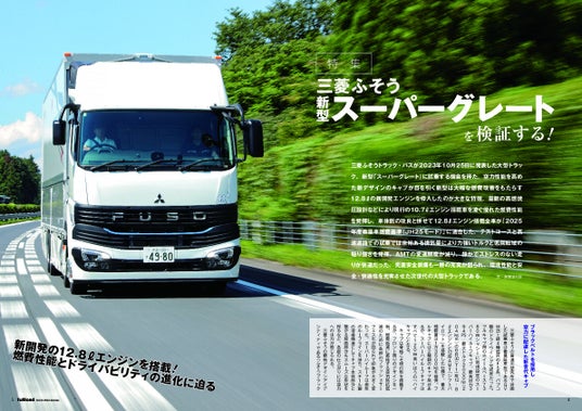 今号の目玉は何といっても三菱ふそうトラック・バスが2023年10月に発表した大型トラック、新型「スーパーグレート」の試乗。空力性能を高めた新デザインのキャブをはじめ、大幅に燃費向上を果たしている新開発の12.8Lエンジン搭載などトピックスも満載。その進化度を試乗によって解き明かす!