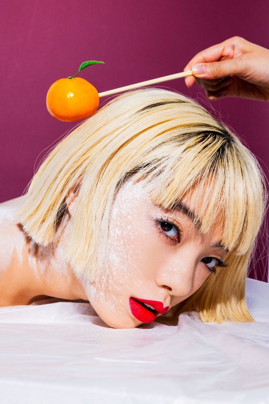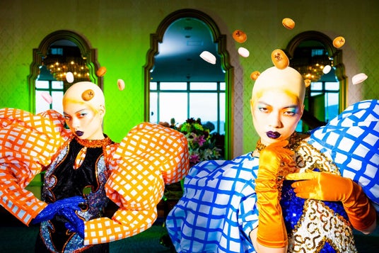 2019年頃からスタートしたクリエイティブコレクティブ「海老坐禅」。メンバー構成はパフォーマンス / アオイヤマダ、アートディレクション / 河野未彩、撮影 / 磯部昭子、ヘア&メイクアップ / 冨沢ノボル、スタイリング / 二宮ちえ、ワッショイ / Oi-chan。