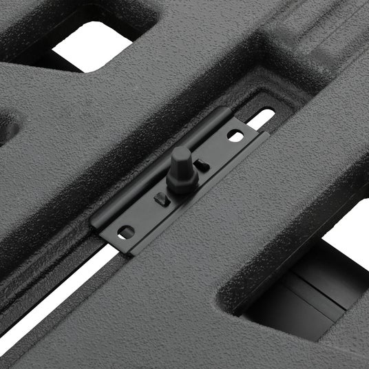 多数のベルト穴を配置し、積載物に合わせて最適な位置で固定が可能。穴の形状や間隔などは、ベルトをかけた際にしっかり固定できるよう、ねじれや偏りが生じないように設計。また、フラットな天面で荷物のスライドがスムーズです。多数の穴による中空壁が構造強度を高め、最大積載量75kg(当社金属製と同等)を実現します。