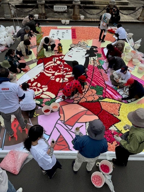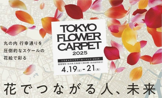「皇居外苑フラワーカーペット」制作風景  「皇居外苑フラワーカーペット」完成作品  開催初日の4月19日(土)16時からは完成セレモニーが開催されます。当日はゲストに歌舞伎役者の中村橋吾さんが出演、花歌舞伎作品をキャンバスに創作歌舞伎を披露する他、NORA SUZUKIさん(オルケスタ・デ・ラ・ルス)、エリック・フクサキさんによる、花で繋がる世界平和へのメッセージソング「One Piece to Peace(作詞:藤川靖彦/作曲:金子隆博)」も初披露されます。 【開催概要】 ■開催名称:TOKYO FLOWER CARPET 2025(トウキョウ・フラワーカーペット2025)