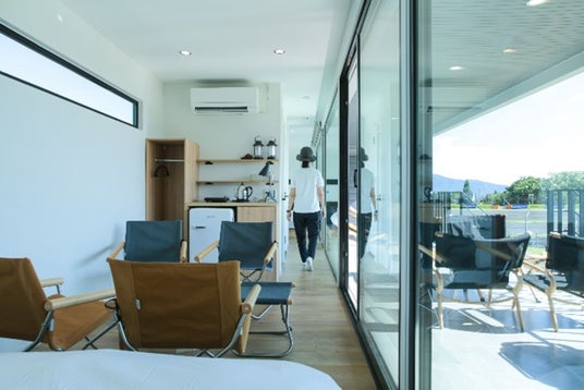 まるでホテルのような設えのトレーラーヴィラ。冷暖房、トイレ、シャワー、冷蔵庫、Wベッド完備の充実設備に加え、デッキスペースにはハンモック、BBQガスグリル、キッチンも備えております。