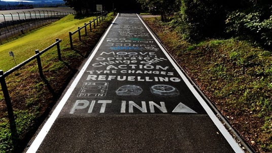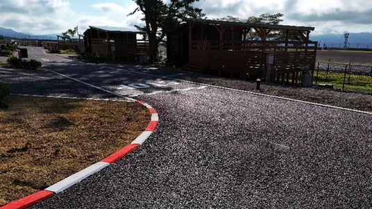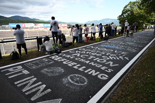 キャンプ場の入り口では路面アートがお客様をお出迎え。モータースポーツやキャンプ、我々がこの場所に込めた想いに関連したワードやイラストが路面いっぱいに描かれています。しかしこれで完成ではありません。お客様にもこのアートづくりにご参加いただき、お客様と一緒にこのキャンプ場を育てていきたいと考えています。