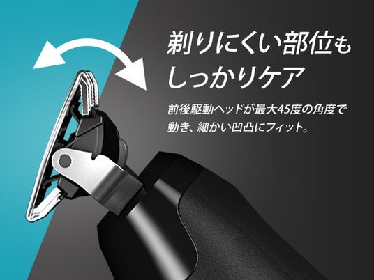 ヘッドが最大45度の角度で前後に動き、体の細かい凹凸部分にもぴったりフィット。剃り残しにくい密着シェービングを実現。