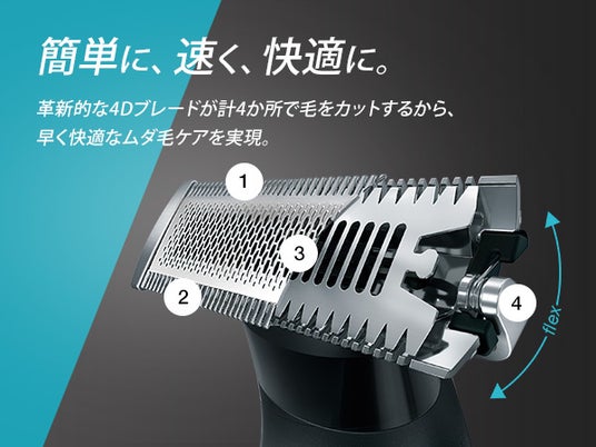 多種多様な刃で⽑をカットするので、⽑詰まりせず、やさしく快適なムダ⽑ケアを実現。