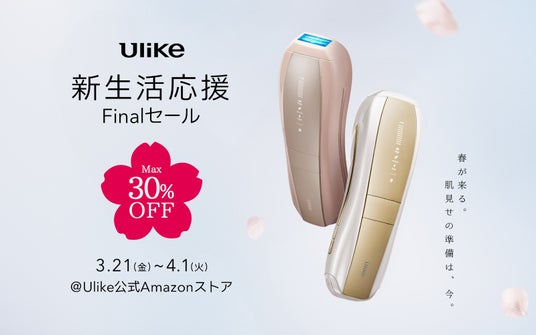 家庭用美容機器メーカー「ユーライクジャパン株式会社」(本社:東京都港区)は、光美容器世界NO.1(*1)ブランド「Ulike(ユーライク)」の商品が最大35%OFFになる『新生活応援!Finalセール』を3月21日(金)より、Ulike公式Amazonストアにて開催いたします。