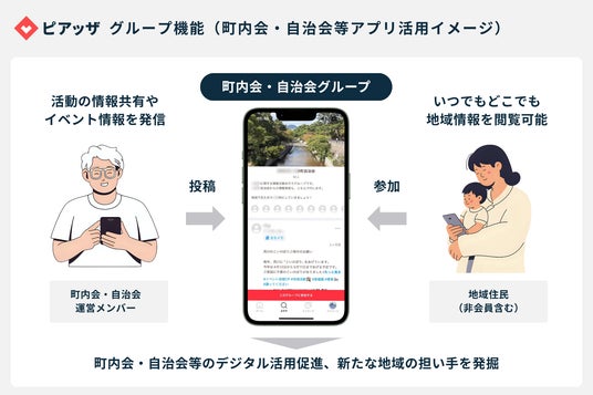 - ニュース:防災・防犯情報や自治体ニュース等を閲覧できます <ピアッザの特徴> - 地域住民同士のリアルなつながりを創出デジタル上での気軽な情報交換ができるだけでなく、不要品のお譲りやイベント参加を通じてリアルでつながる機会を創出。同じエリアで暮らす人同士、心地よい距離感で地域交流ができます。