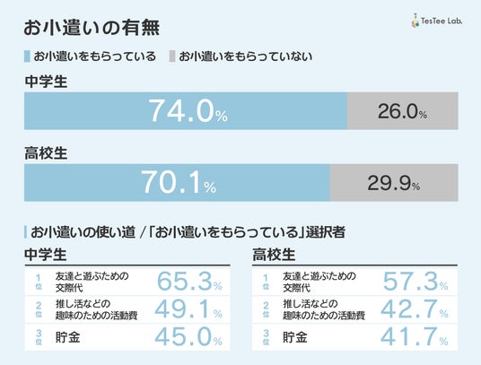 リサーチ事業・プロモーション事業・マーケティング事業を展開する株式会社テスティー(本社:東京都渋谷区、代表取締役:服部峻介)は、若年層リサーチ結果を発信する「TesTee Lab」にて、中学生・高校生の男女601名(中学生男女300名、高校生男女301名)を対象に「お小遣い」に関する調査を実施しました。