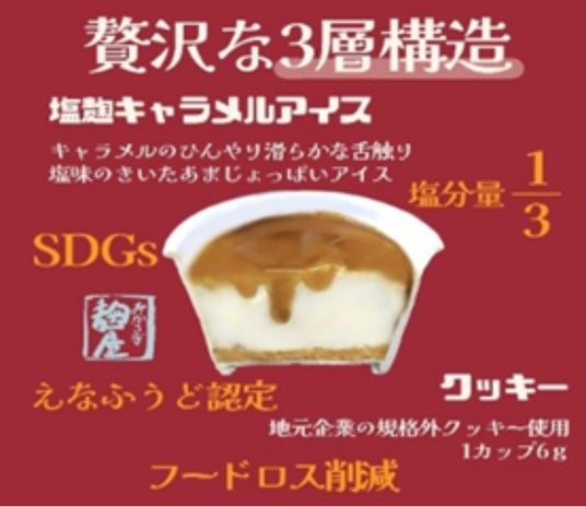 このアイスクリームは、3層構造となっており、中央部には恵那市のみかさぎ麹屋の塩麹を使用したアイスクリーム、最下部には地元メーカーの規格外となったクッキーを使用し、食感の変化を楽しめます。最上部はキャラメル層で、ひんやり滑らかな舌触りとほろ苦く香ばしい風味を引き出しており、フードロス削減に貢献している商品です。