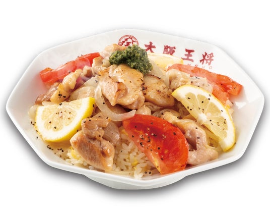 玉子炒飯の上に、チキン、レモン、トマトとバジルソースをトッピング。大阪王将に今までなかった爽やかな炒飯をお楽しみいただけます。