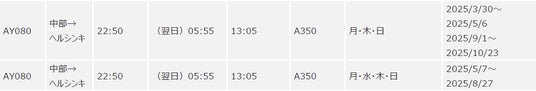 現在、フィンエアーのセントレア路線は2024年5月に運航再開後、冬ダイヤでは運休、2025年3月30日より始まる夏期スケジュールでは、週2便から週4便に増便します。
