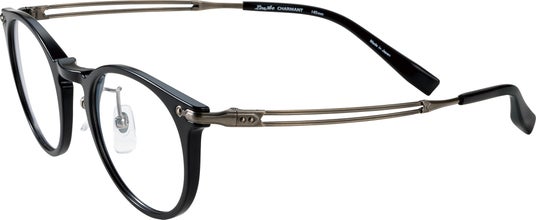 印象的な目もとをつくるコンビフレーム。黒縁のボリューム感とテンプルの細いラインのコントラストが大人な雰囲気。