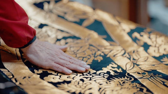 西陣織とは、京都の西陣で生産される先染めの紋織物です。織ってから染めるのではなく、先に染められた糸を複雑に織りあげて模様をつくるため、完成までには多くの工程と技術が必要となる高級な織物です。※西陣織は西陣織工業組合の登録商標です