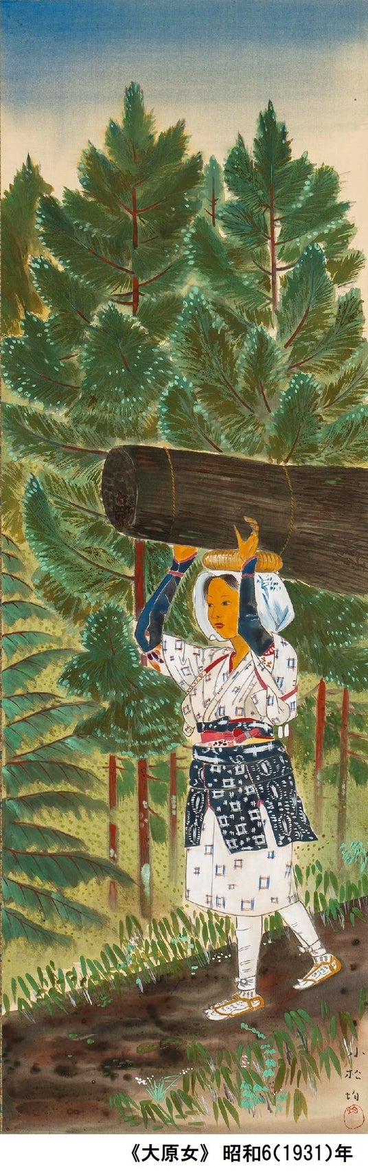 京都で出会った大原女や舞妓の人物画、小松の画業の転機となった牡丹のほか、大原の暮らしの中の身近なものを描いた作品を紹介。