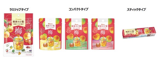 「健康のど飴梅」は、「菓子のど飴」のパイオニアとして培ってきた「健康のど飴」の伝統や素材へのこだわりを表現したパッケージデザインへとブラッシュアップ。「健康のど飴梅」のイメージを持ちやすいよう、これまでカラー展開を行っていたコンパクトタイプ、スティックタイプ、ラミジップ(ジッパー付き袋)タイプの全てをテーマカラーの1色に統一しました。