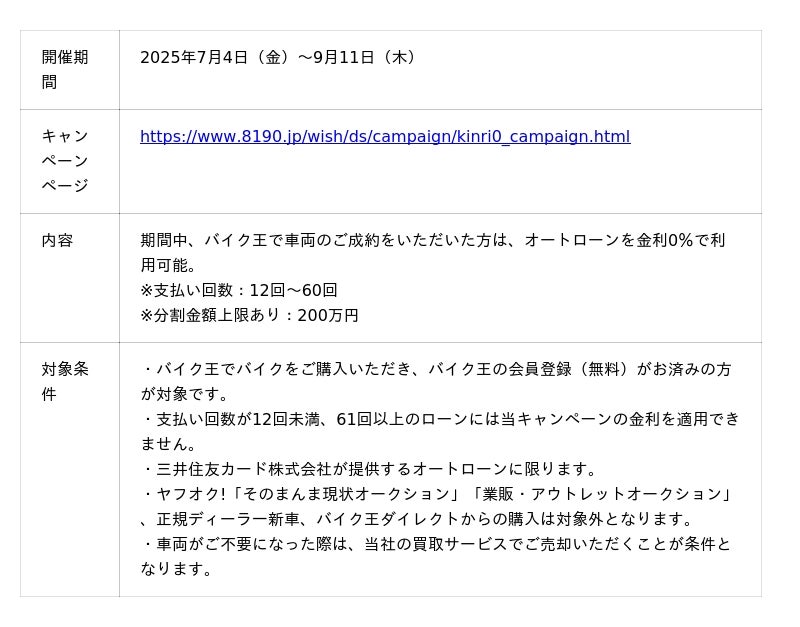 「まだ世界にない、感動をつくる。」をコーポレートミッションに掲げ、ビジョンである「バイクライフの生涯パートナー」の実現に向けて、事業を展開する株式会社バイク王&カンパニー(代表取締役CEO:澤篤史、本社:東京都世田谷区、証券コード:3377、以下「当社」)は、登録者数20万人超(2025年7月3日現在)の人気バイク系YouTuber、せんちゃんが7月4日(金)にバイク王公式アンバサダーに新たに就任したことをお知らせいたします。これにあわせ、同日より当社創業30周年記念として、創業30周年大感謝祭「ローン金利0%キャンペーン」をスタートいたします。 せんちゃん 公式アンバサダー就任コメント この度、バイク王公式アンバサダーに就任しましたバイク系動画クリエイターのせんちゃんと申します。普段は地元である静岡県沼津市を拠点に、ツーリングの様子を記録した「モトブログ」をYouTubeにて公開しております。バイク王さんとの出会いはNinja ZX-25Rの試乗会でした。そこから数年経った今、まさか公式アンバサダーに選ばれるなんて…!たいへん光栄に思っております。今後はバイクの楽しさだけではなく、バイク王さんの魅力も皆様に届けられるように頑張ります!YouTubeという媒体を通してバイク王をより身近な存在に感じてもらえたら嬉しいです。 アンバサダー就任第一弾の活動として、バイク王世田谷本店で撮影した動画を、私のYouTubeアカウント限定で公開(7月4日(金)17時公開予定)します! また、バイク王公式TikTokで私がライダーの皆さんにインタビューする動画も公開予定となっていますのでぜひ見てください! バイク王公式TikTok https://www.tiktok.com/@bike_queeeen せんちゃんYouTubeアカウント https://www.youtube.com/@senchans せんちゃん プロフィール静岡県沼津市出身のバイク系動画クリエイター。 現在のYouTubeチャンネル登録者数は20万人。 親子でツーリングを楽しむモトブログや旅行VLOGを公開している。 沼津ふるさと応援隊としても活動中。 バイク系YouTuberとして人気が高く、ツーリングを中心としたコンテンツを発信するせんちゃんは当社が発信するバイク系コンテンツと親和性が高く、そのキャラクターを活かしながらバイクの楽しさなどの情報発信をしていただけるものと考え、このたび新たにアンバサダーとして起用いたしました。今後、関東圏で人気のツーリングスポットである宮ヶ瀬などでバイクライフの楽しさを発信していく予定となっておりますので、ご期待ください。 今がチャンス!バイク王の良質中古バイクをお得に買おう!創業30周年大感謝祭「ローン金利0%キャンペーン」スタート 創業30周年を記念して、バイクをご成約いただいた方がオートローンを金利0%でご利用いただける大感謝祭『ローン金利0%キャンペーン』を、7月4日(金)から9月11日(木)までの期間限定で実施いたします。 通常、ローン金利0%は、126cc以上の中古バイクへの買い換えの応援企画として実施しておりますが、当キャンペーンでは、排気量不問で買い換えに限定しないキャンペーンとなっております。バイクの乗り換えをご検討中の方はもちろん、現在バイクをお持ちでなくこれから中古バイクの購入をご検討の方にも、期間限定の大チャンスとなっております。 バイク王に並ぶ中古バイクは、良質である車両を選び販売しており、在庫も数多く揃えております。この機会にぜひご利用ください。 ※内容の詳細・対象条件については、「ローン金利0%キャンペーンページ」をご確認ください。 ▼ローン金利0%キャンペーンページはこちら https://www.8190.jp/wish/ds/campaign/kinri0_campaign.html 期間限定!創業30周年大感謝祭「ローン金利0%キャンペーン」詳細
