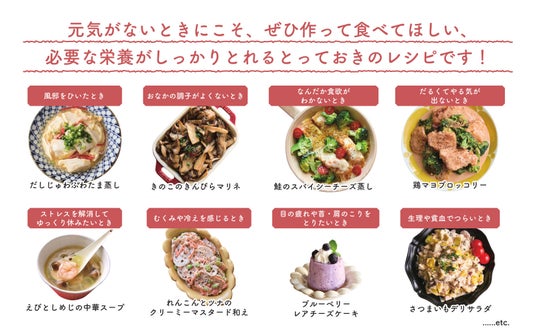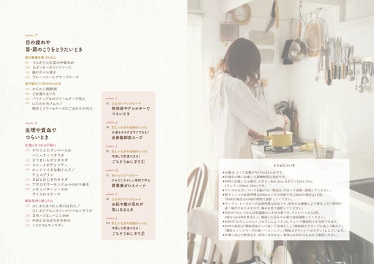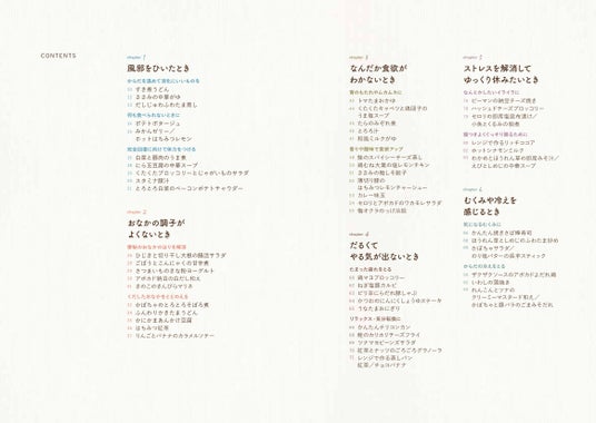 風邪気味、食欲不振、胃腸の不調ほかの症状、体調不良に加えて、やる気が出ない、ストレスを感じる…といったメンタル面での不調、さらに、むくみや冷え、目の疲れや首・肩のこり、生理や貧血……などといった女性特有の悩み、症状に関する項目も盛り込んだ、日常のちょっとした心身の不調を整えるためのレシピ集です。管理栄養士でもある人気料理研究家・倉嶋里菜が考案した、ごく普通の食材でささっとかんたんに作れる、そしておいしいメニューを多数紹介します(お悩み別レシピ全108品収録)。体の中から調子が整うことはもちろん、見栄えもいい料理は、作るだけで気分が明るくなれるかもしれません。レシピの紹介とともに、症状ごとに必要な栄養素やそれらを摂取できる食材についての解説なども交え、普段の食生活にも役立つさまざまな豆知識も掲載します。