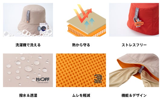 Unplugのサウナハットは、撥水・透湿性に優れる「H2OFF(R)︎」と、独自の3層構造「軽量3Dメッシュ」を採用。この組み合わせにより、頭の温度上昇を抑え、のぼせを防ぎます。