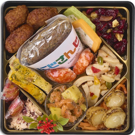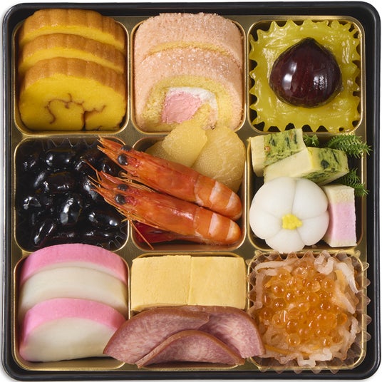 伊達巻、ロールケーキ(いちご)、きんとん、渋皮栗甘露煮、黒豆、数の子、有頭海老、博多高野(海老)、博多高野(ほうれん草)、花餅(白)、紅蒲鉾、白蒲鉾、牛タンスモーク、だし巻玉子、紅白なます、鱒いくら