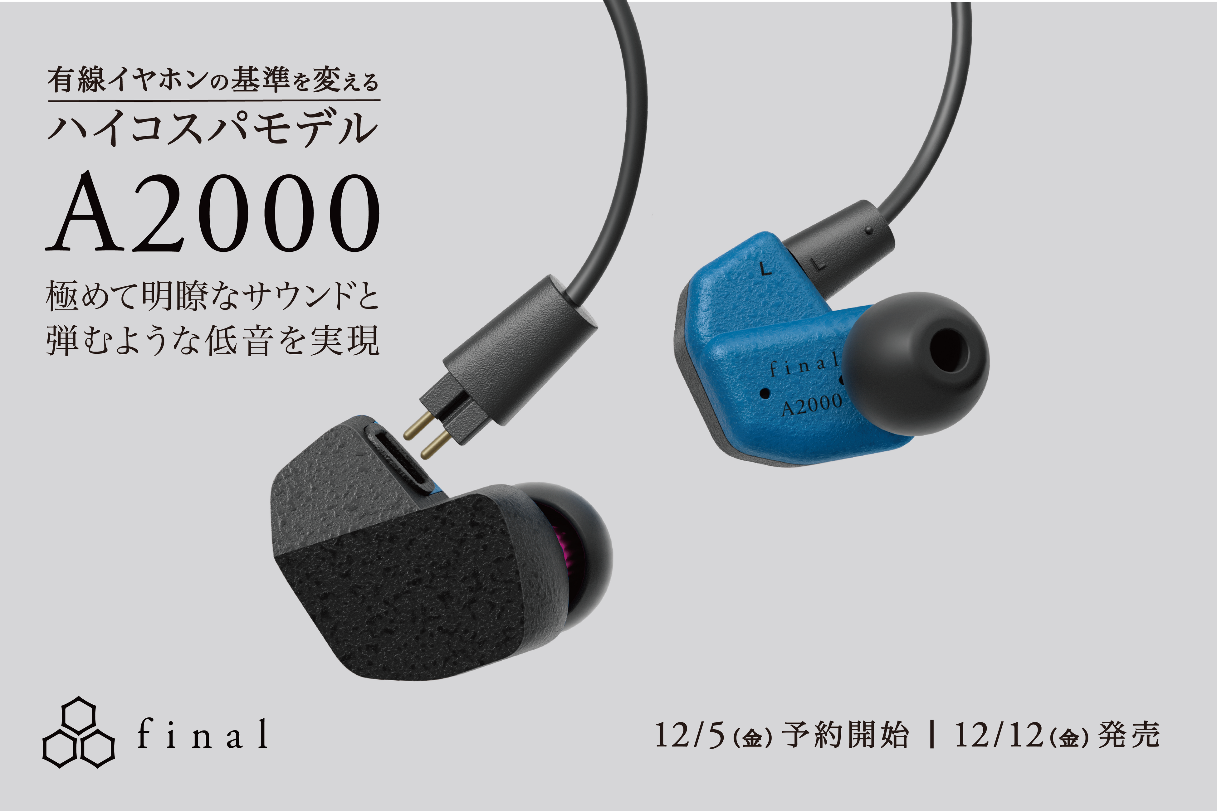 国内オーディオメーカー株式会社final(代表:細尾 満、本社:神奈川県川崎市)は、有線イヤホン「A2000」を本日2025年12月5日(金)より予約開始、2025年12月12日(金)より発売いたします。