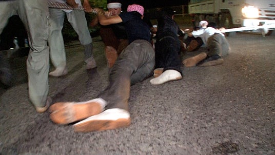 祭り本番までだんじりを曳いて練習できるのは試験びきのときだけ。それまで、夜ごとに集まってだんじりに見立てた4トントラックを綱で引く練習につぐ練習を重ねる。