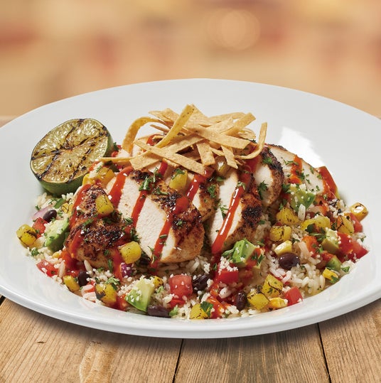 スパイシーにグリルしたチキンをバターライスにトッピング。グリルパイナップル、ガーリック風味のブロッコリー、ピコデガヨ、アボカド、ブラックビーンズを彩りよくトッピング。甘辛いパイナップルチポトレソースで仕上げました。フライしたトルティアでアクセントを加え、パクチーとパルメザンチーズで彩りを加えました。お好みでライムを絞ってお召し上がりください。