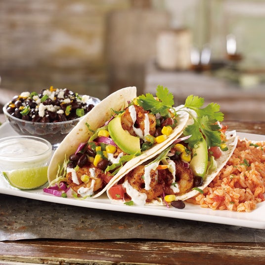 やわらかなトルティアにコールスローをのせ、スパイシーにコーティングしたシュリンプをトッピング。爽やかなサワークリームソース、ブラックビーンズコーンピコデガヨ、ケソフレスコ チーズでアクセントを加えました。仕上げにグリーンオニオンとアボカドをトッピング。サイドにオレンジブラックビーンズとトマトチキンライス付き。