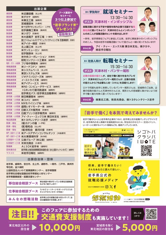 会場では、県内企業や自治体・団体による60ブースに対面相談ができるほか、「いわて暮らしアンバサダー天津木村さん」や「パンサー尾形さん」、「インポッシブル」をゲストとしてお呼びし、企業の若手職員や経営者らが「岩手で働く魅力」を発信するトーク形式のセミナーを実施します。