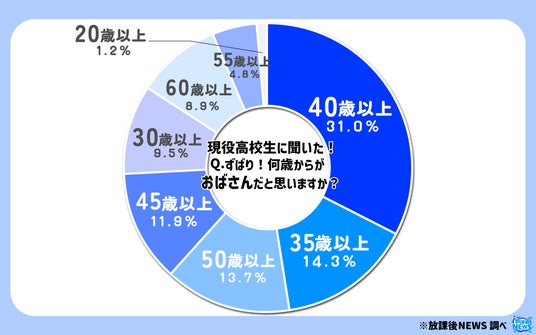 「30代ではキレイな人がたくさんいる」 「40過ぎたあたりから老化が目に見えてわかるから」と言った声が 目立った結果となっており、 単純に見た目的に今の30代は若く、その若さに限りがくるのが 40歳を過ぎてからと考えている高校生が多くいたようです。【「35歳以上」は”おばさん”という声も目立つ】