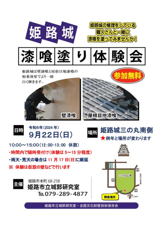 姫路城の壁修理、屋根修理で実際に行われている漆喰塗りを、文化財修理に携わる職人に手ほどきを受けながら体験します。