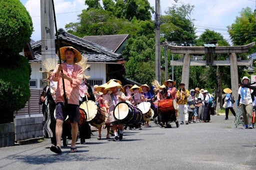 サエキ囃子コロナ禍の中で生まれた交野市の新しい郷土芸能。子どもから大人まで、桶太鼓を担いで踊り歩くお囃子です。例年7月に私市で虫送り祭りを行っています。