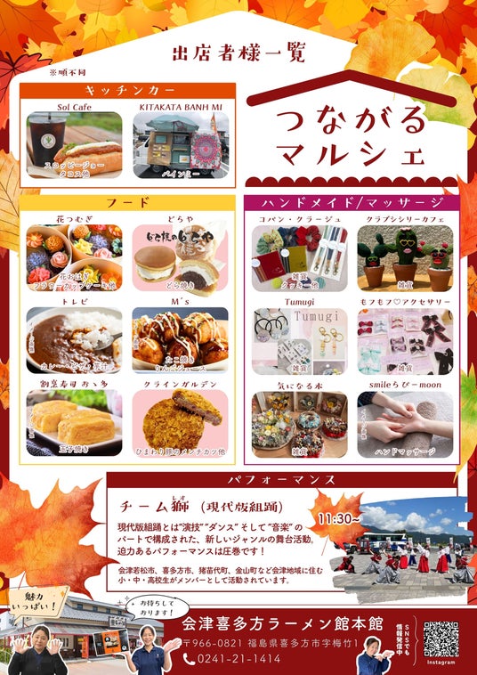 [喜多方ラーメン・お土産販売店] 株式会社河京エンタテインメント会津喜多方ラーメン館本館(本社:福島県喜多方市 取締役社長:土屋充孝)は、【第10回つながるサミット】を11月10日(日)に開催します。今回のイベントは『お客様・地域企業の皆様とつながる』をテーマに、<チャーシュー炊込みご飯の素2種&チャーシューカレーセットの特売><河京工場直送のラーメンつかみどり><キッチンカー><地元のお店のフード販売><ハンドメイドマルシェ>など企画盛りだくさんでお届けします。
