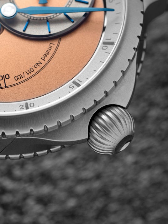 PULSE One Blue / PULSE One Sand PULSE One(パルス ワン):モダンメカニカルな新モデル クロノスイスの2025年新作『パルス ワン』は、ルツェルンのアトリエで設計・製造をされています。最新のデザインとクラフツマンシップを融合した大胆で、個性的な「モダン・メカニカル」な新モデルです。 『パルス ワン』の開発において、クロノスイスの熟練した時計職人たちは常識を打ち破ることに挑戦し、機械式時計の芸術の境界線を再び押し広げました。「Watches & Wonders 2025」に向けてクロノスイスのDNAを再定義し、軽量で耐久性に優れたブレスレット一体型のチタン製(グレード5)ケースを採用。そして自動巻きの自社開発キャリバーC.6001を搭載した、力強さとモダンさを兼ね備えたデザインに仕上げられています。 ケース一体型チタン製ブレスレット フルチタンジャケット新たに考案・設計されたチタン製(グレード5)ケースは、クロノスイスの歴史の中で初めて登場する、ケース一体型のチタン製(グレード5)ブレスレットです。 シームレスなケースと、美しい曲線を描くフォルムは、機能との完璧なバランスを実現しました。ルツェルンのアトリエで、これまで製造したモデルの中で最も流麗なブレスレットです。 クロノスイスのDNAの象徴オニオンクラウン 再構築されたレガシー変化するものもあれば、永遠に変わらないものもあります。 クロノスイスのDNAの象徴であるオニオンクラウンは、揺るぎなく存在し続けており、妥協を許さない職人によって創り出されています。 自社開発キャリバーC.6001 すべての鼓動に込められたマニュファクチュールムーブメント部分は、ルテニウムメッキのクロノスイス自社開発キャリバーC.6001を搭載。 象徴的な3Dレギュレーターと、6時位置のレトログラード秒針を特徴とするこのタイムピースは、動き、リズム、そして動きの中の時間への賛歌です。 わずか各100本限定の『パルス ワン』は、クロノスイスの現代性を絶え間なく追求する姿勢を示す、2つの印象的なモデルを発表します。 パルス ワン サンド/CH-6823T-BRSI PULSE One Sand (パルス ワン サンド)4Nサンドブラストおよびカラーダイヤルを特徴とし、暖かさと活力を放射します。 パルス ワン ブルー/CH-6823T-BLSI PULSE One Blue (パルス ワン ブルー)パワー、深さ、ダイナミズムを呼び起こす、深いブルーのダイヤルを特徴としています。 Technical Data