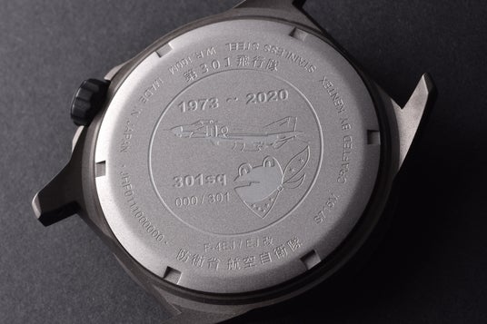 夜間視認性を確保するスーパールミナス夜光、伸縮性のあるエクステンションナイロンベルトも装備。裏蓋には機体シルエットと部隊マーク、限定シリアルNo.を刻印。さらに、部隊マーク入りスリーブ、ワッペンが付属する特別仕様。