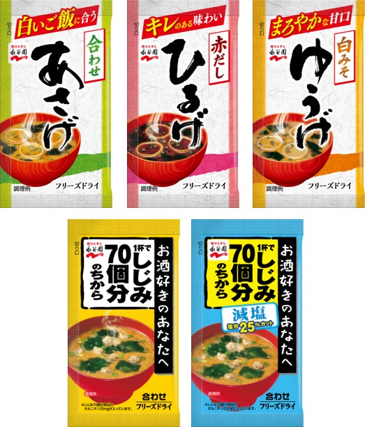 株式会社 永谷園(社長:掛谷 浩志、東京都港区)は、フリーズドライ(FD)粉末みそ汁シリーズから、おいしさはそのままに、使い切り設計でより試しやすくなった1食タイプの「フリーズドライあさげ 1袋」「同ひるげ 1袋」「同ゆうげ 1袋」「同 1杯でしじみ70個分のちからみそ汁 1袋」「同 1杯でしじみ70個分のちからみそ汁 減塩 1袋」(税抜70円)を2025年3月3日(月)より全国で新発売いたします。
