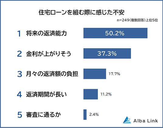 株式会社AlbaLink(本社:東京都江東区、代表取締役:河田 憲二)は、住宅ローンを組んだことがある249人を対象に「住宅ローンを組む際に感じた不安に関する意識調査」を実施し、そのデータをランキングにしました。