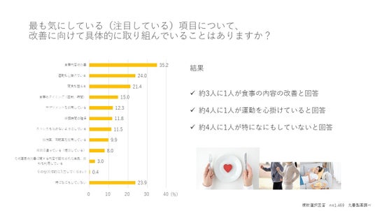 調査2で選択された項目について、改善に向けての取り組みを確認しています。約3人に1人が食事内容の改善と回答し、約4人に1人が運動を心掛けていると回答。一方で約4人に1人が特になにもしていないと回答しました。